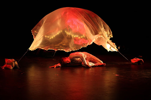 “In the performance’s climactic moment, a shining cape was lifted into the air by a fan. The billowing fabric evoked a queer jellyfish, under which a dancer churned and rolled about the floor.”