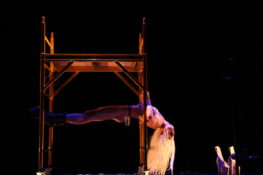 “David Lee Sierra opened with Public Structures of Feeling, a rich and disturbing endurance performance… Pounding techno music and droning synthesizers accompanied Sierra mounting a piece of scaffolding, where she found precarious balances and excruciating holds tangled among the bars.”