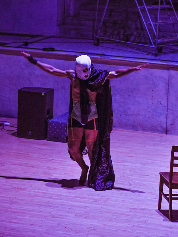 Through further explorations of chaos force as a current that can be harnessed and transformed into subversive material, capeforce, with flying boots and all (excerpt) bathes in the communal subterranean currents of the dead and the ghosts of the fugitive and social zombie. As a metzu zombie dance, this compositional and choreographic exploration invites the black imagining and the borders of madness into a dance with triple consciousness herself.