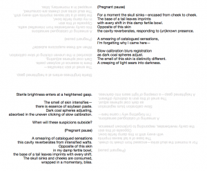 Filling in these gaps through movement and voice, maybe the body can summon distant memories of mother/child, land/home. Working with natal intimacy and womb-like sensibility, I imagine birthing and being birthed; the pain, the sensuality?, and feeling of fresh emergence. I like to believe that this exploratory embodiment reflects 20% truth; I allow the approach of embodying this duality to escape to fantasy, as I have not experienced birthing and I will never remember the experience of being birthed.