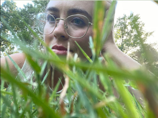 Alison Kopit, photo by Alison Kopit Image description : Alison, a white femme with wire-rimmed glasses and blue eyes and brown hair, lays on the ground. Her face is partially obstructed by blades of grass, and leafy trees in mid-summer rustle behind her. She rests the side of her face on her hand and looks past the camera.